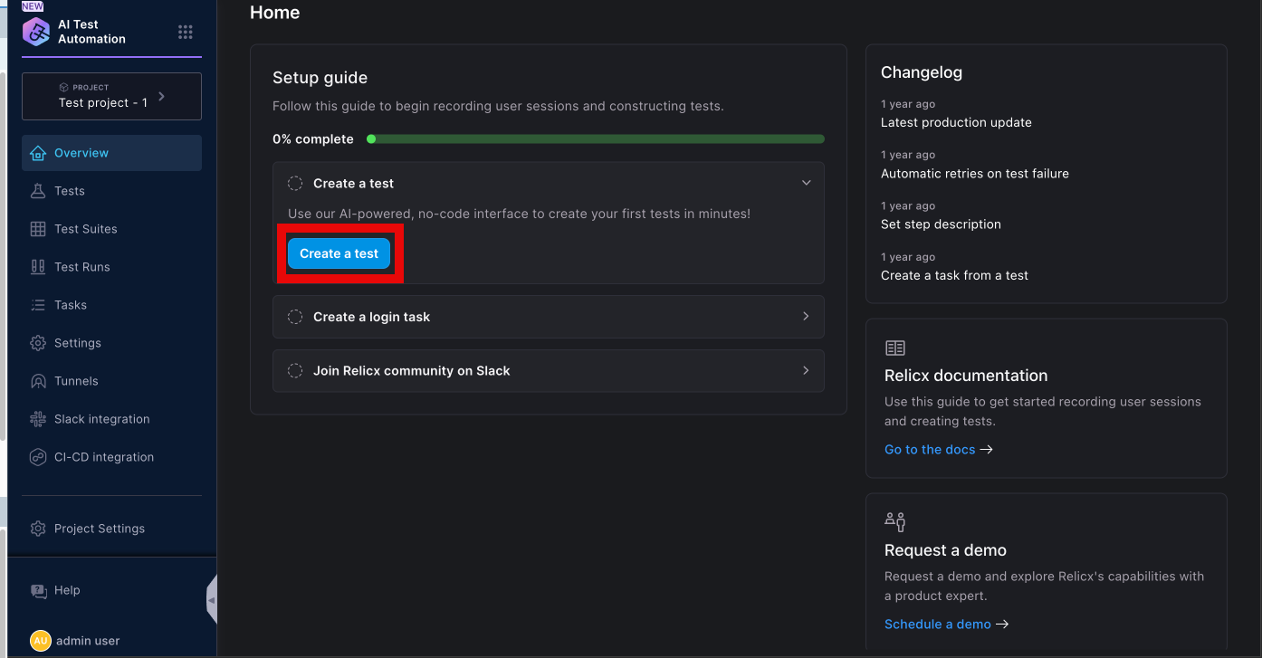 Once you enter the details and click on create environment you will land on the dashboard page. Now you are ready to create your first test.