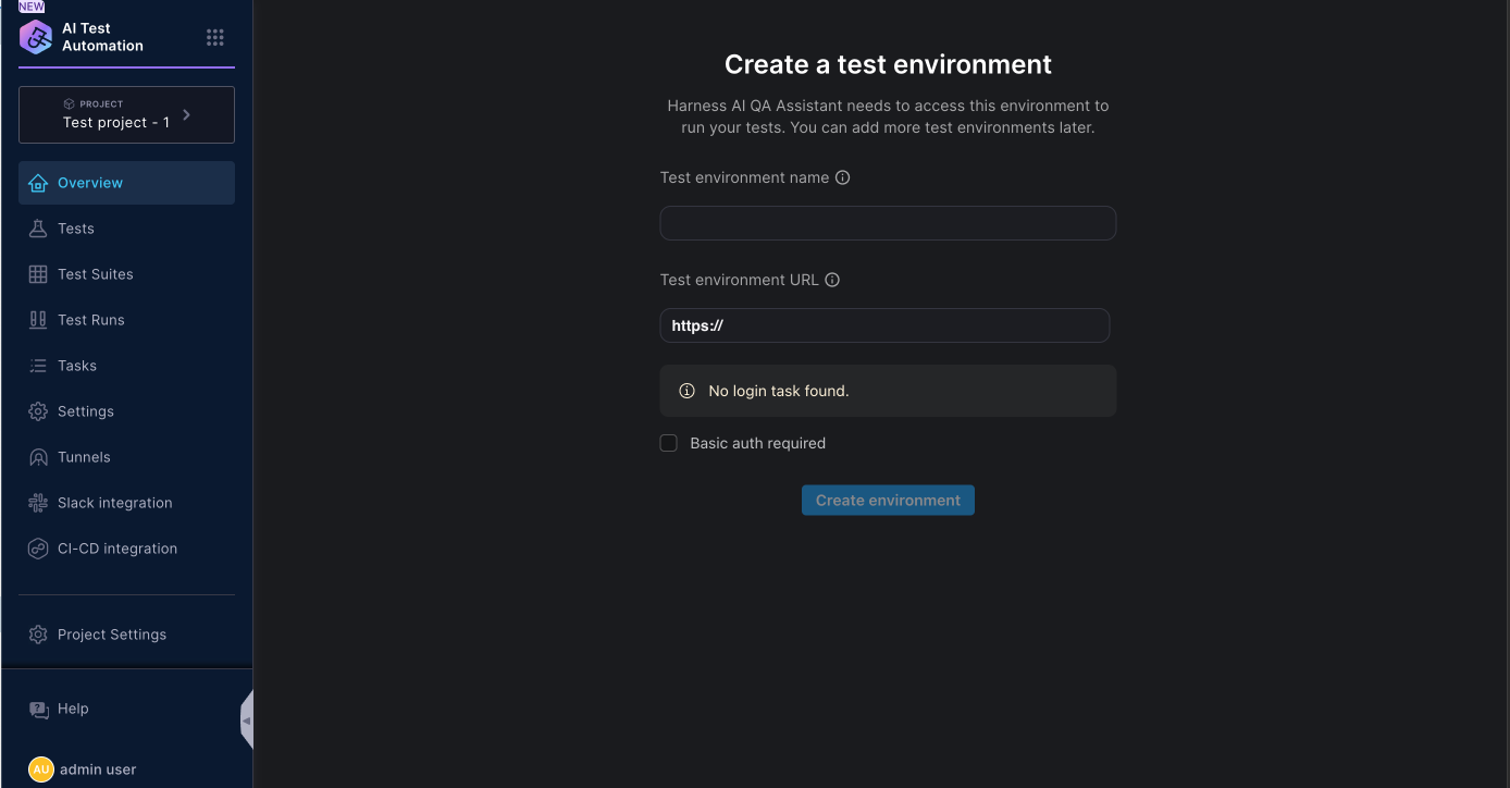 In AI Test Automation, projects created in the Harness platform are automatically inherited as applications. When the user accesses AI Test Automation from the available modules they are prompted to enter the environment name and an URL. This is usually the URL to your test environment. Make sure to enter the URL that you will use to access the application in your browser. This URL may redirect to a login screen and ask the user to enter the credentials. While recording tests we will add the credentials.