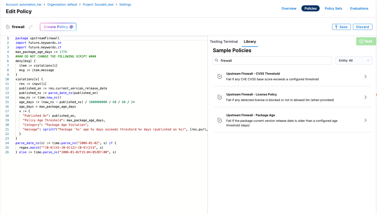 Important: When customizing policies, ensure that the output format of the policy remains the same. The Dependency Firewall expects a specific output structure to properly evaluate and categorize violations.