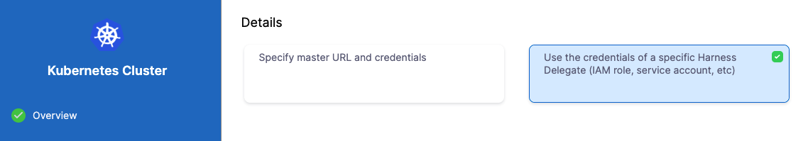 2. In Details, select Use the credentials of a specific Harness Delegate. We will select the Delegate next.