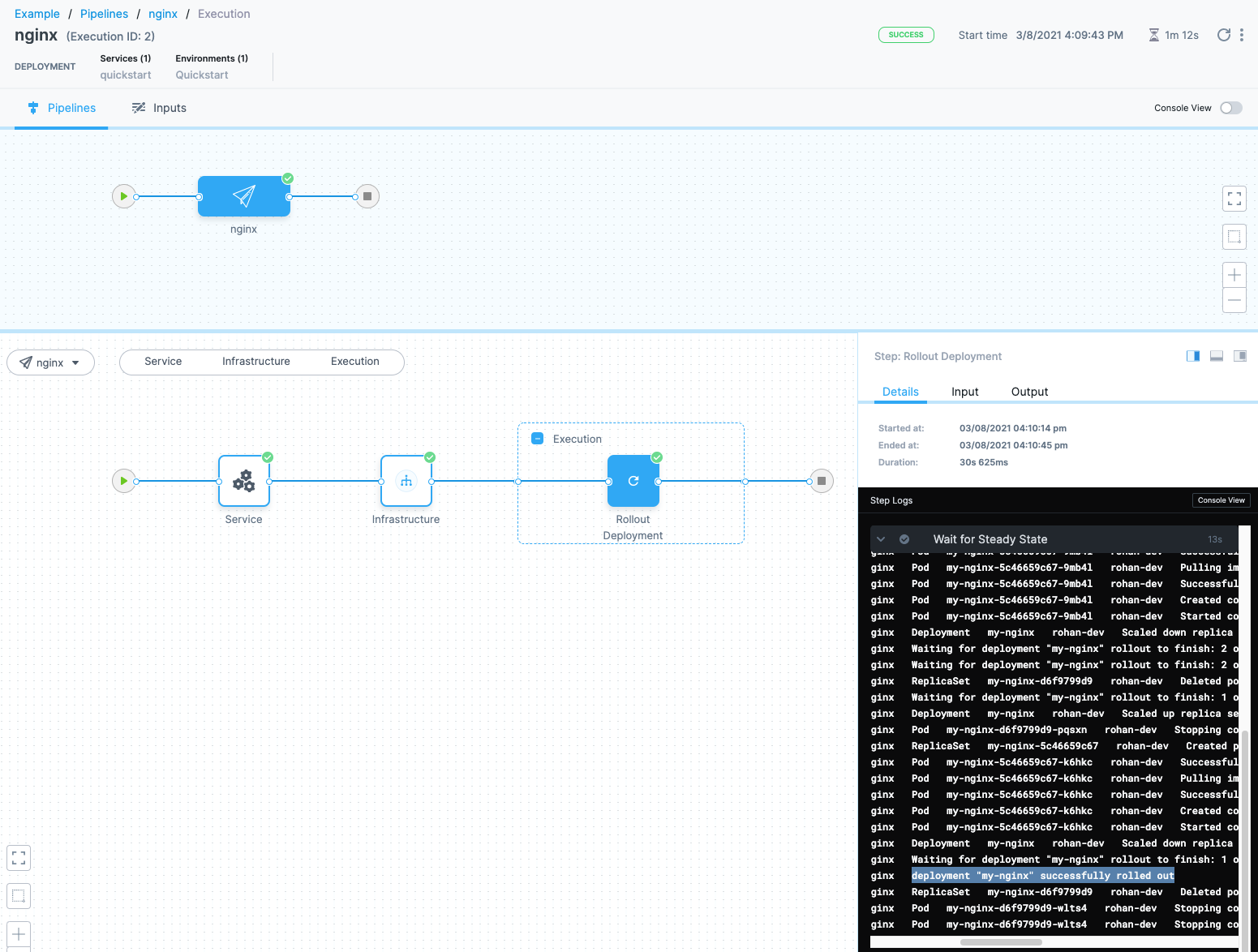 4. Toggle Console View to watch the deployment with more detailed logging. Select the Rollout Deployment step and expand Wait for Steady State.