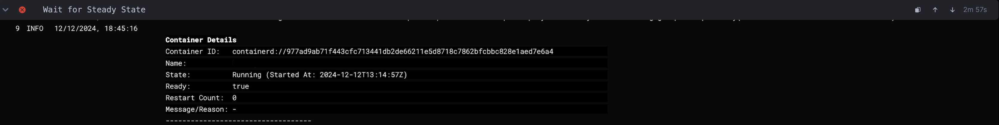 These logs include detailed information from status.condition, status.containerStatuses, and status.initContainerStatuses during the Wait For Steady State step.