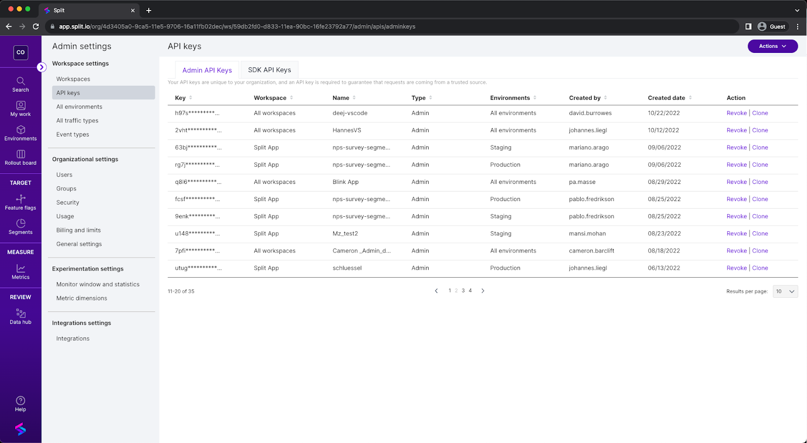 Use these steps to edit the name, description, tags, and expiration dates of tokens under API keys. You can also rotate tokens.
