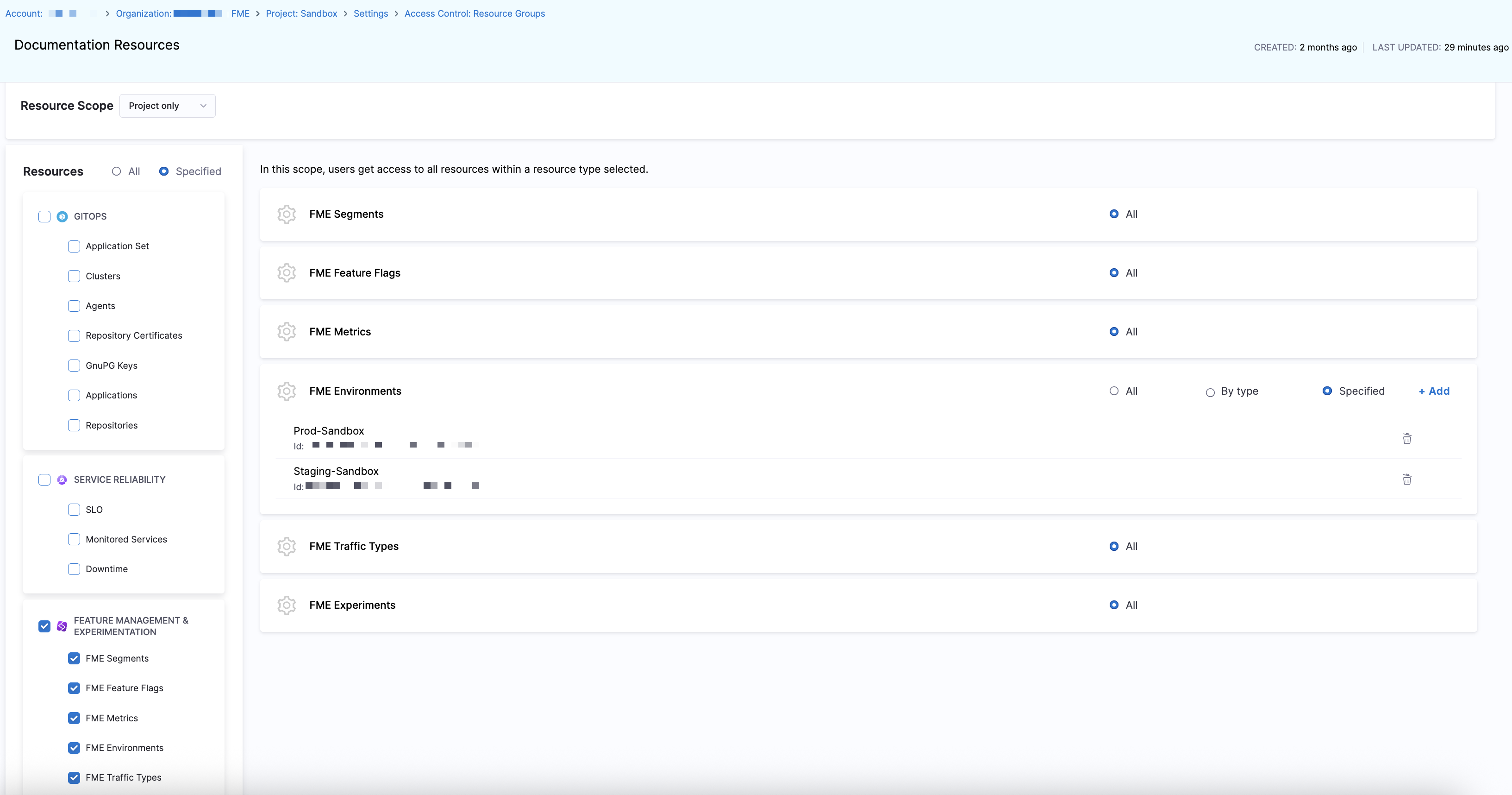 If you are a Harness FME administrator, you can use Resource Groups to control access to FME resources by specific environment and create custom roles to support granular permissions.