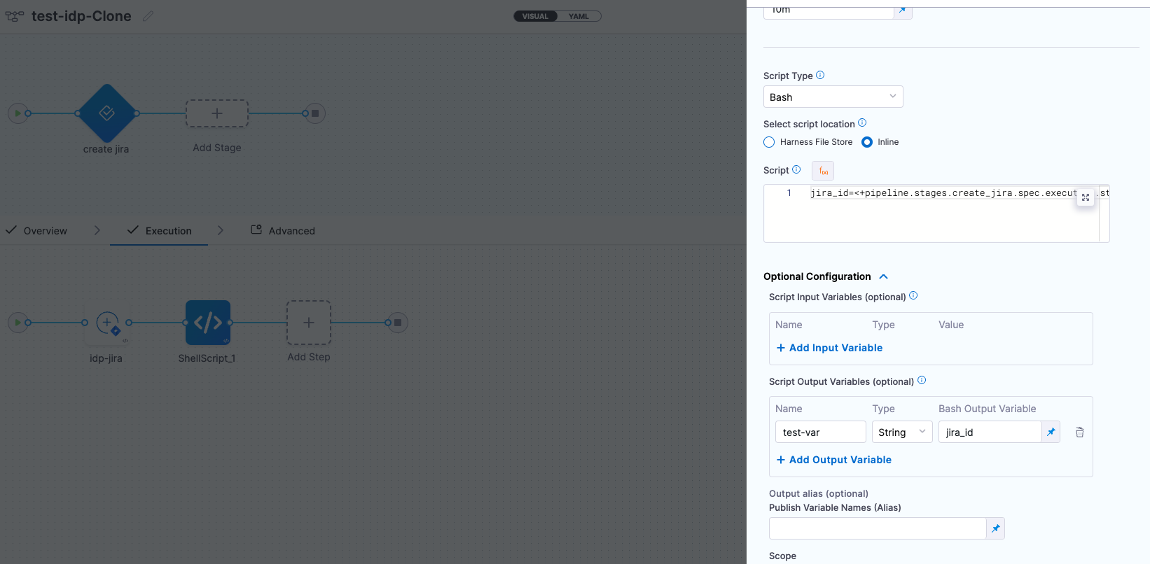For example, if a system-generated output variable is jira_id, you can define it as a user-defined output variable under Optional Configuration by assigning it to a new variable, such as test-var. This newly defined variable (test-var) can then be displayed as output in the IDP workflows.