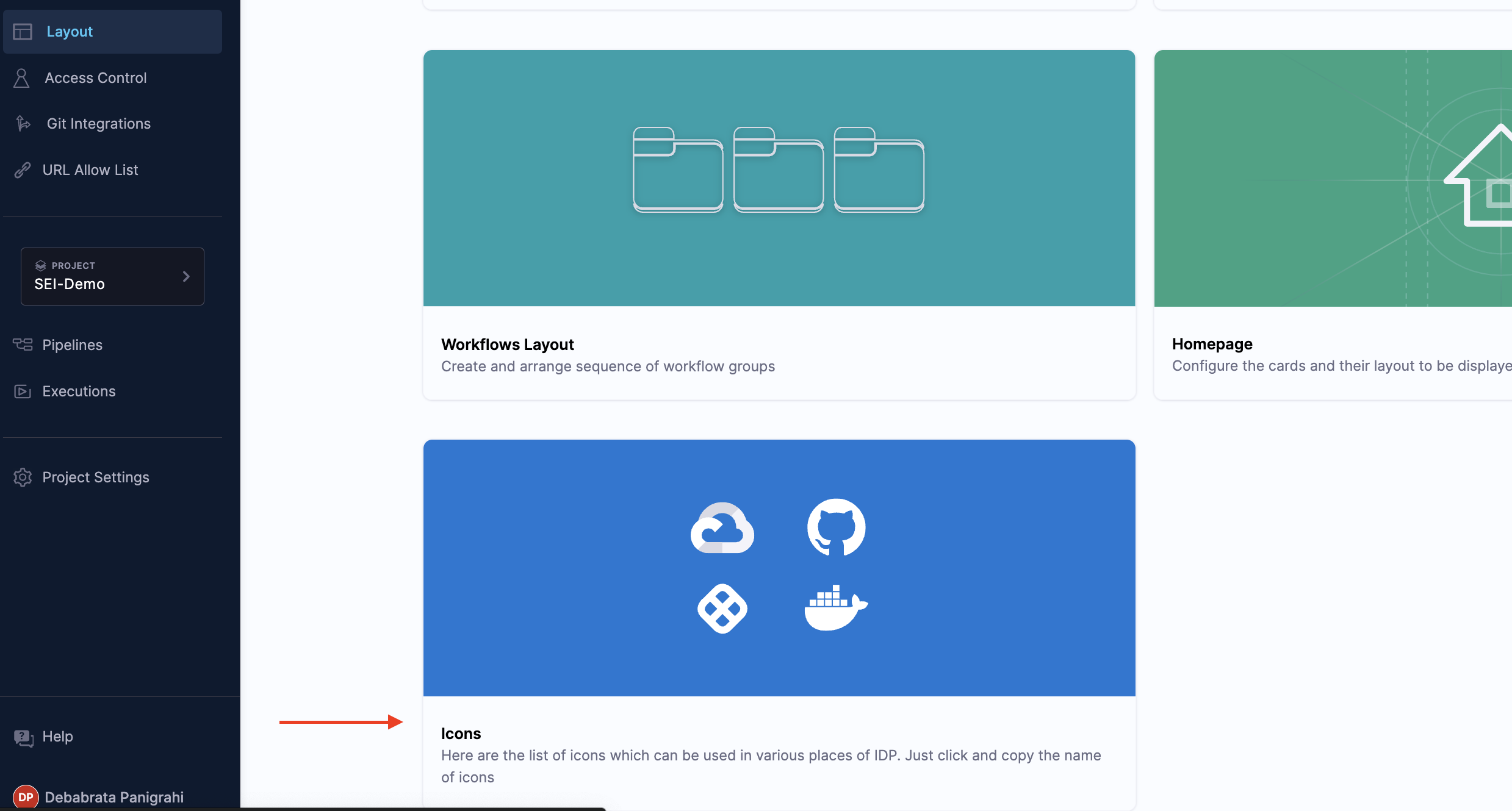 Platform Engineers (users assigned with the role of IDP Admin or having Layout edit permission) can customize the Workflows homepage under IDP Admin -> Layouts -> Workflows section by creating groups and adding Workflows to each group. These groups can be further customized using a name, icon, and description and they can be arranged in a specific order to determine how they appear on the Workflows homepage.