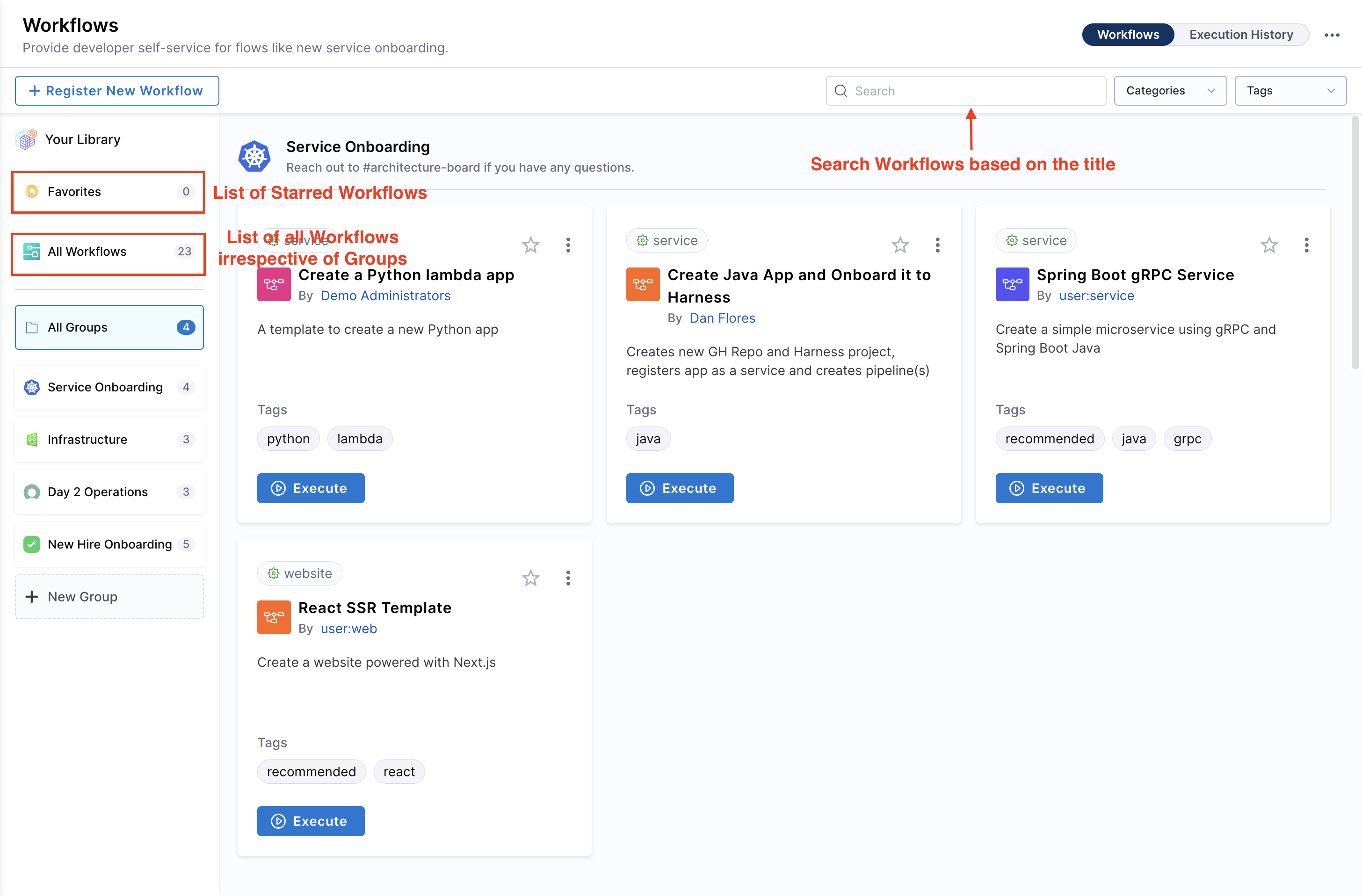 You can organize your IDP Workflows into groups such as Service Onboarding, Infrastructure Use Cases or Day 1 Onboarding using the Workflows Homepage Customization. You can also change the icons of individual groups and each Workflow. You can also change the primary button text from "Execute" to more suitable verbs such as "Create", "Delete" or "Run" with appropriate intent colors. Finally, you can change the order of the groups and Workflows within an individual group as well.