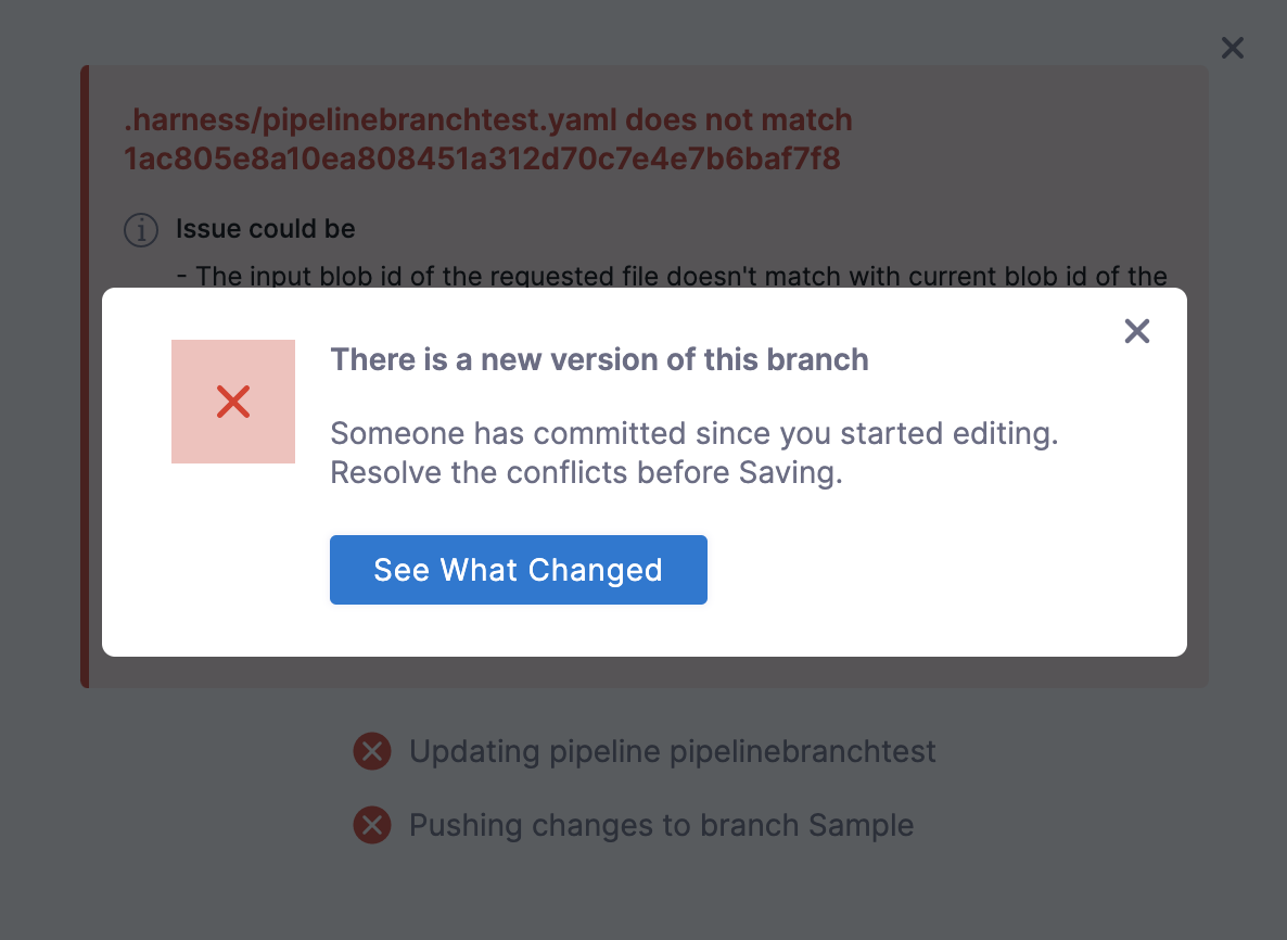 When you commit changes to an entity that has been cached, Harness displays a warning if the cached version of the entity differs from that in Git. To view the differences, click See What Changed.