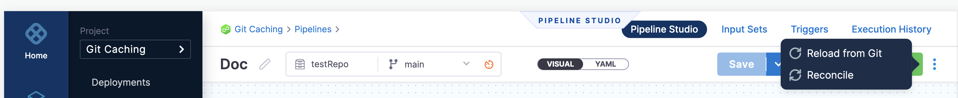 The cache status you see in the UI is only indicative of the cache status of the entity being fetched. Entities referenced within the fetched entity may have different cache statuses. For example, the cache status in the pipeline studio corresponds to the cache status of the pipeline. It is possible for referenced remote templates within this pipeline to have a different cache status. If you select Reload from Git, the caches of all the referenced entities are also retrieved and reloaded from Git.