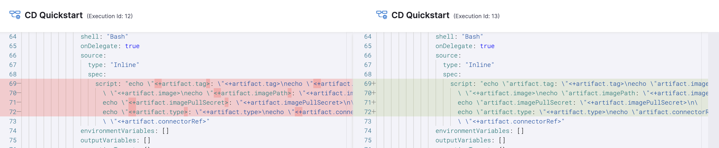 Harness produces a diff of the pipeline YAML for the two executions. This diff helps you identify the changes between executions, and it can help with troubleshooting.