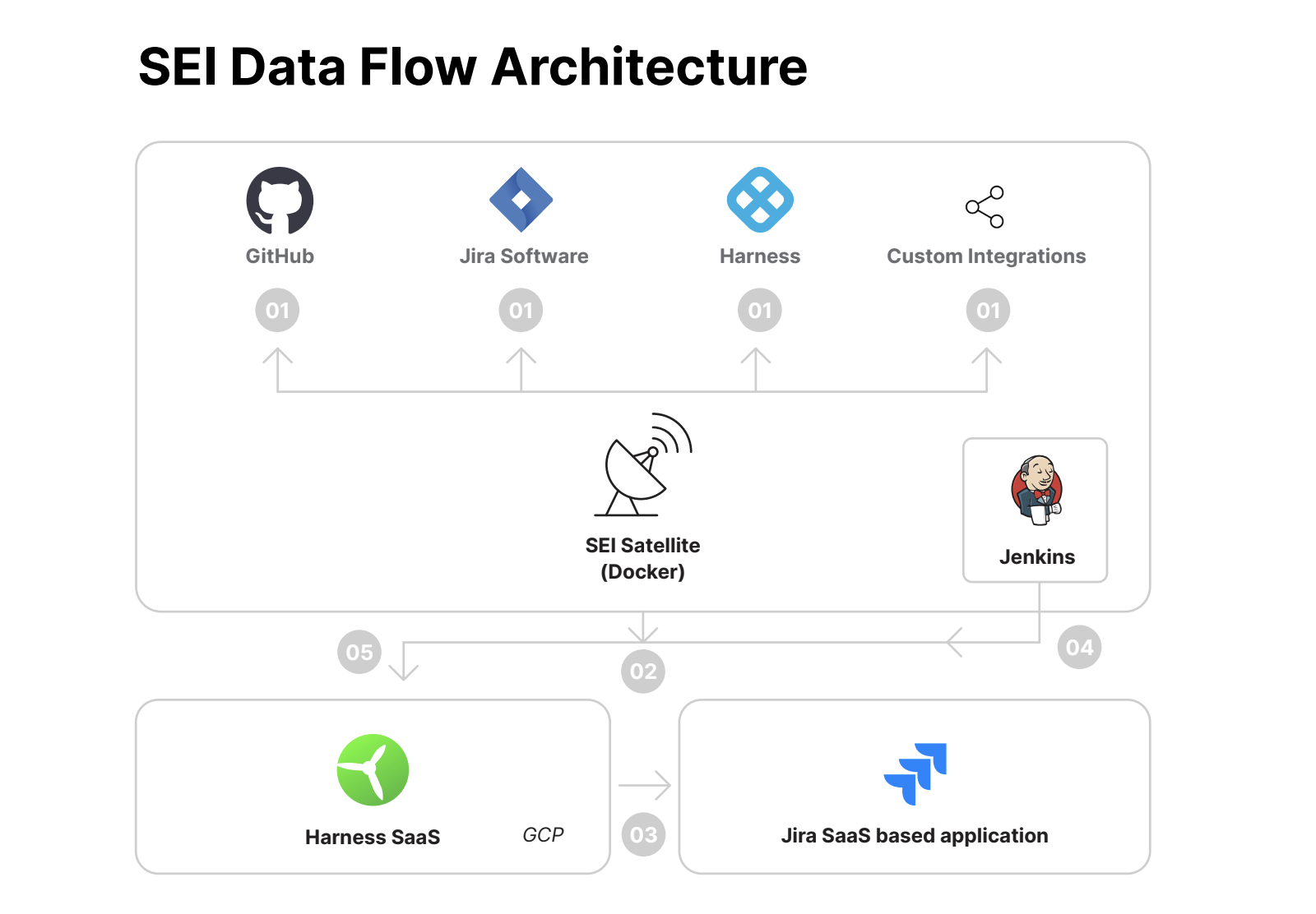 • Outbound Data Flow: The Ingestion Satellite establishes a secure outbound connection to the Harness SEI SaaS API, where it posts the collected metadata.