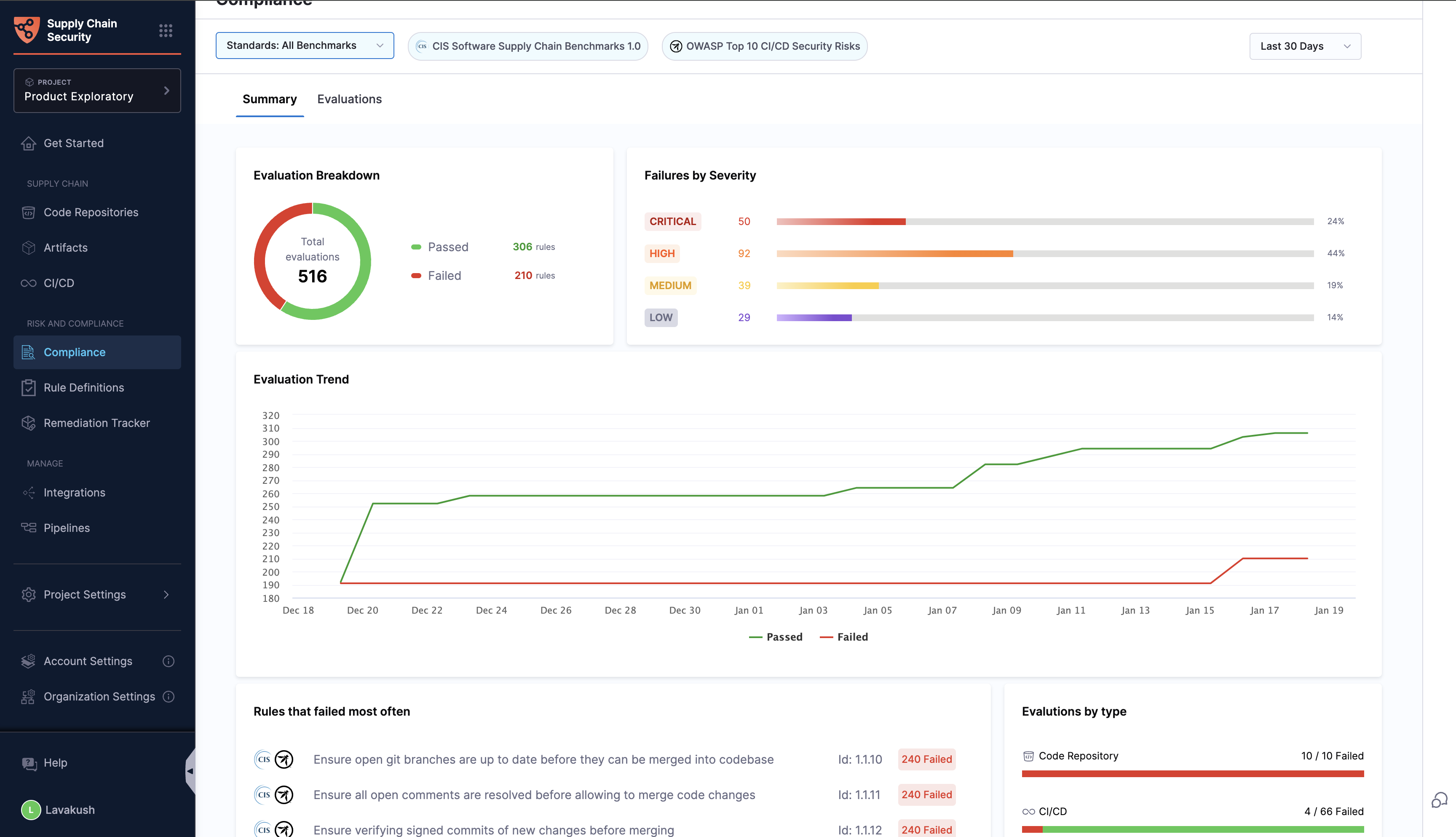 The Compliance section within the SCS module serves as a hub for assessing and understanding the risk posture of your entire supply chain. This section is indispensable for GRC (Governance, Risk, and Compliance) and security teams as it provides detailed evaluation results after applying all relevant rules to various target types within your supply chain. You can access a thorough summary of these evaluations, including the specific rules applied, their execution statuses, and the target types impacted by each rule.