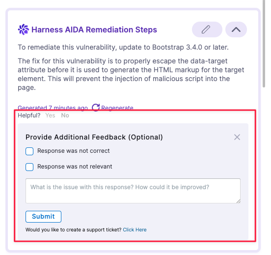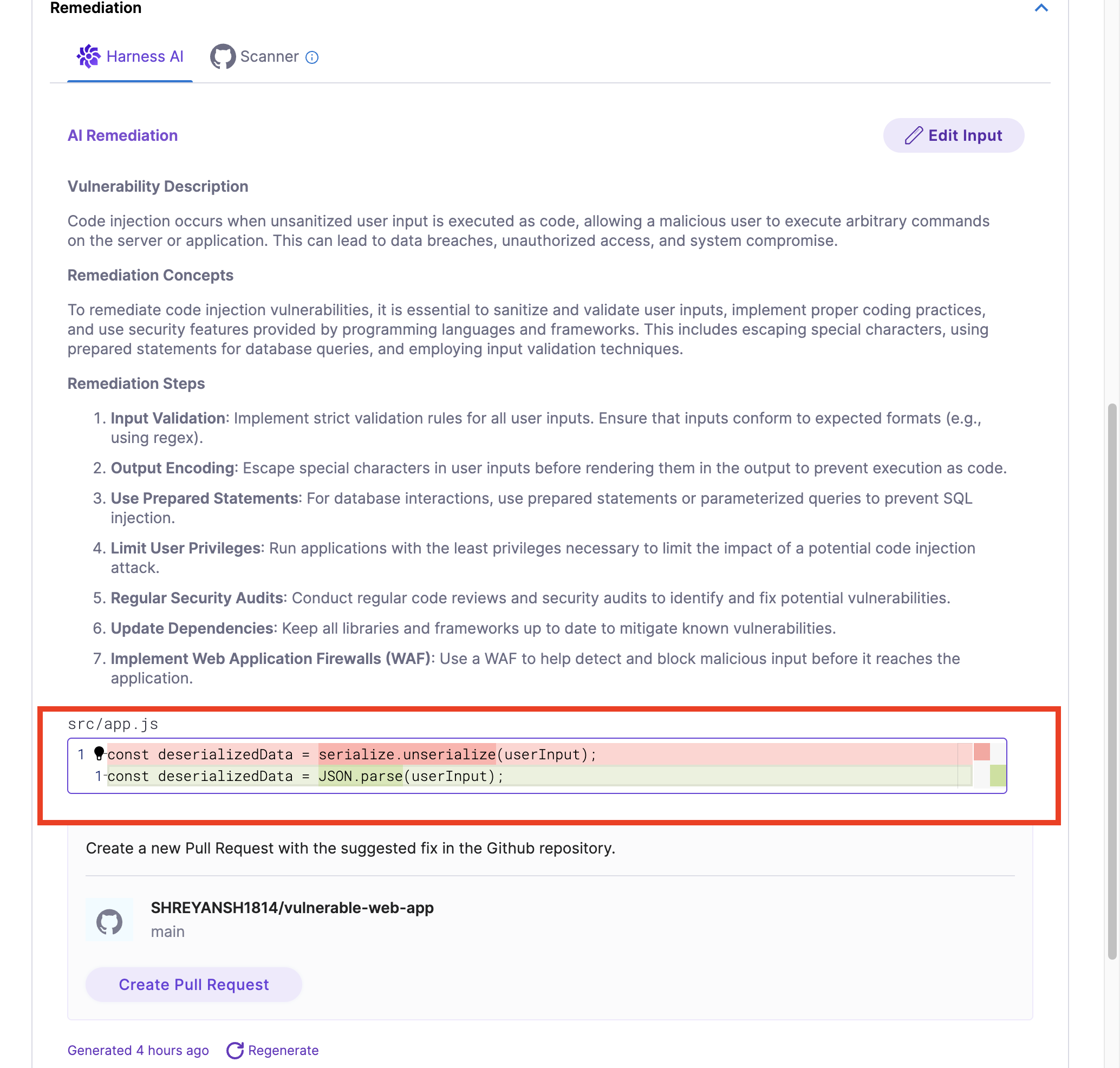 • Added support to display the suggested code diff snippet for the GitHub Advanced Security (GHAS) vulnerability findings. (STO-10151).