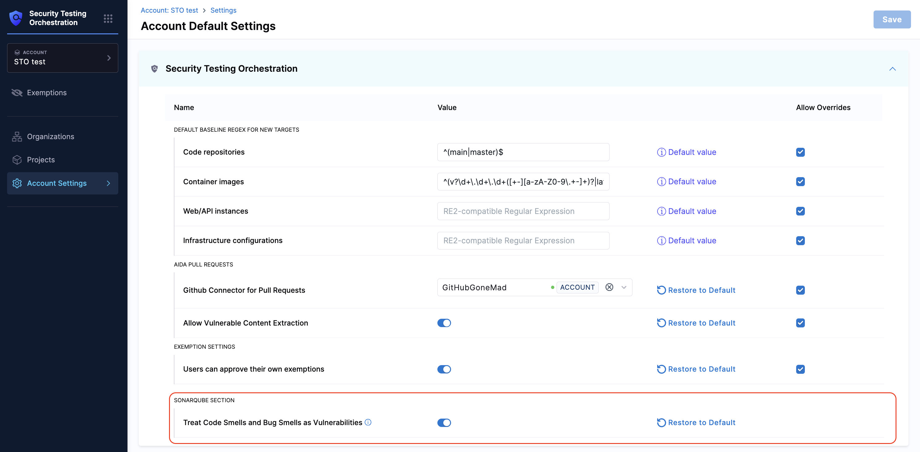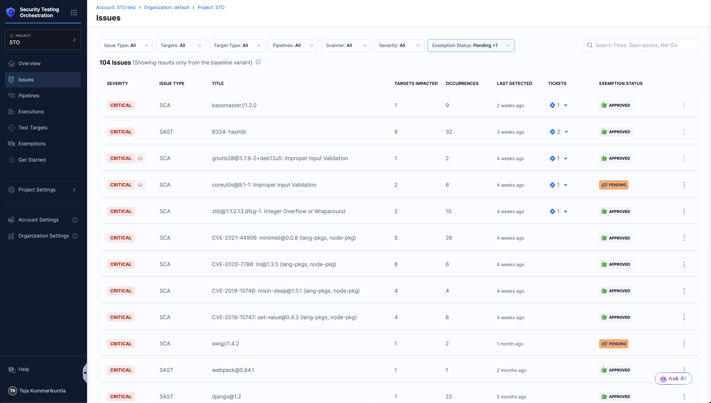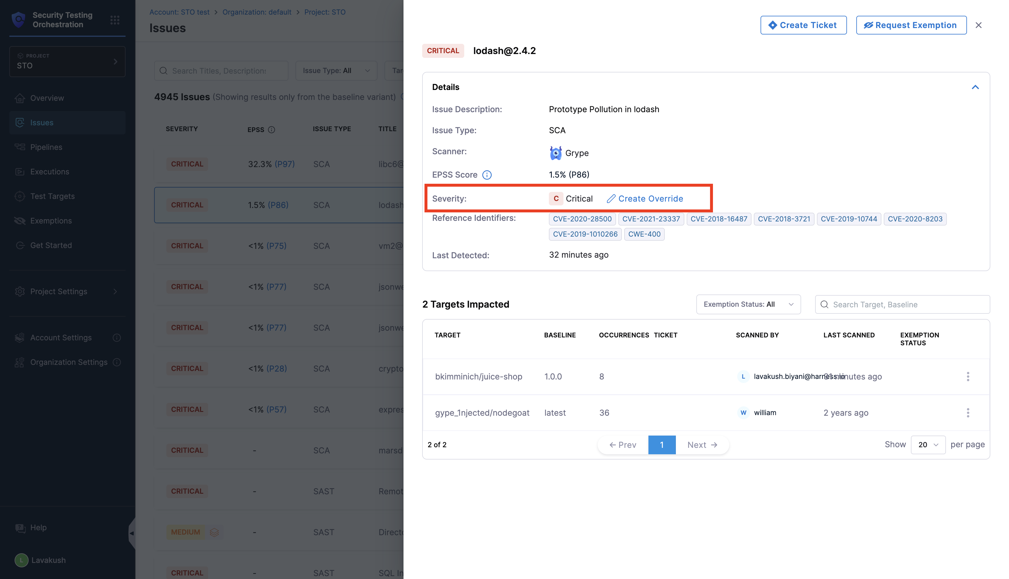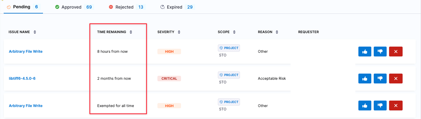 • Dedicated Security Exemptions Section: Ability to grant and manage security exemptions by SecOps owners on identified vulnerabilities or issues during security testing. Exemptions can also be made in the STO Pipeline against specific issues.