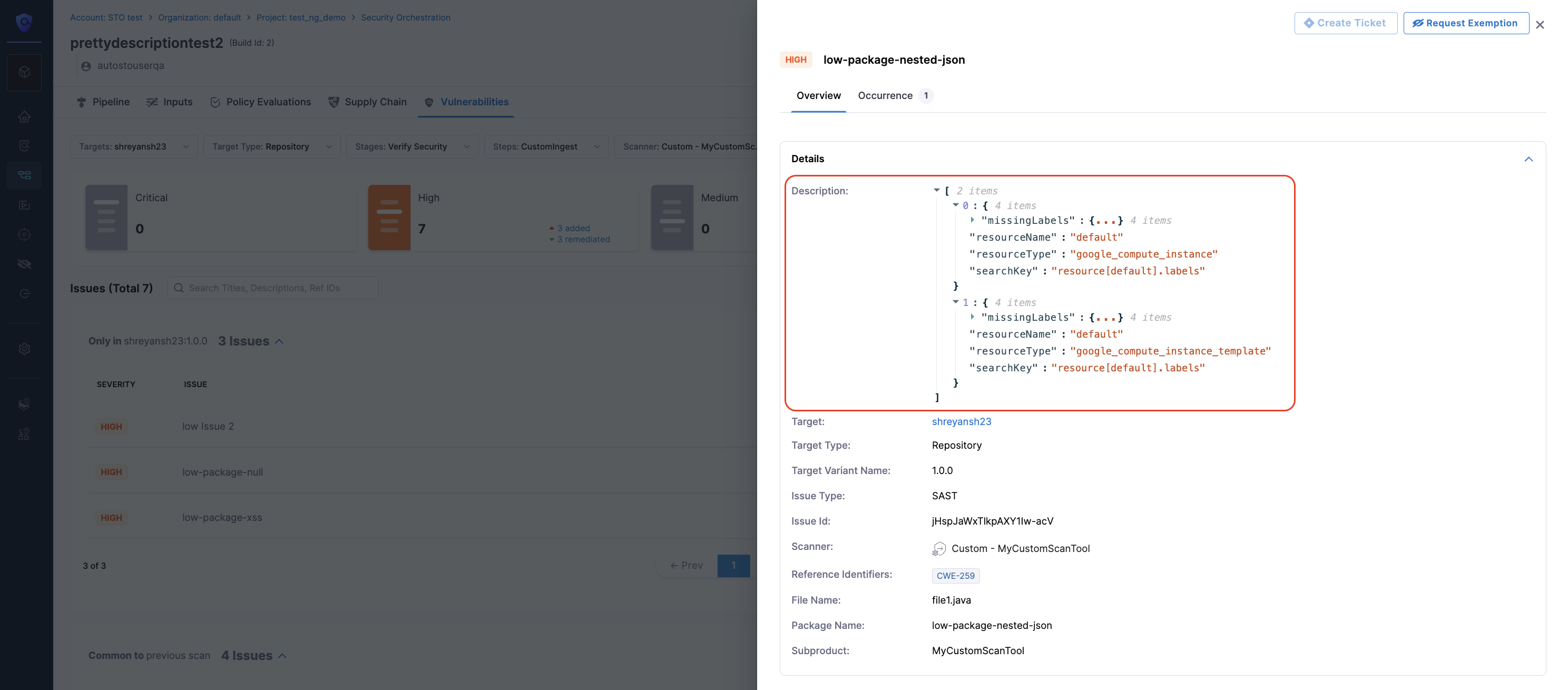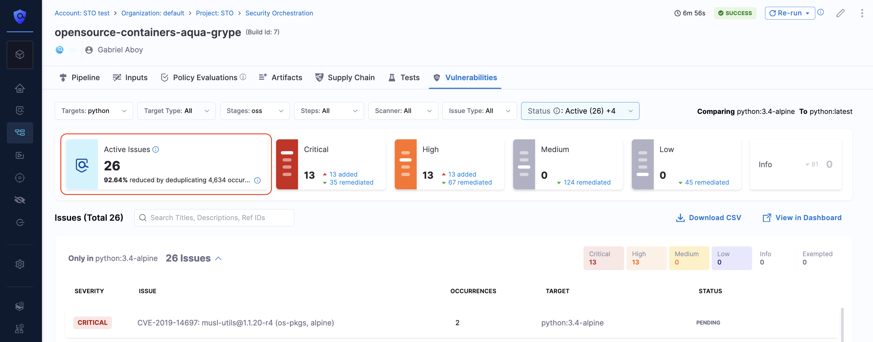 • Security results for STO are now aggregated across all pipeline stages and executions, providing a single, complete view even when pipelines are resumed after a failure. This includes reruns of failed stages and chained pipelines. Previously, results from rerun failed stages or chained pipelines were not combined in the vulnerabilities tab (STO-10231 , ZD-84194, ZD-89153). This feature was behind Feature Flags STO_AGGREGATE_RETRY_EXECUTIONS and STO_AGGREGATE_CHAIN_EXECUTIONS now it is generally available (GA).