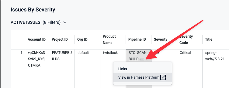 • To view details for an issue from the search results, click the pipeline name or ID and choose View in Harness Platform.
