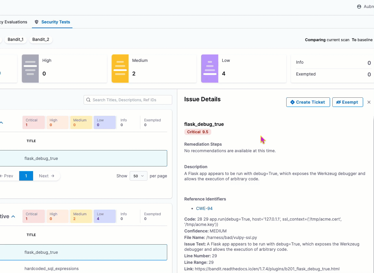 • Bandit scan results have been enhanced. When you open the Details pane for a detected issue, the Raw Details JSON now includes links to further information under _rawIssueCwe : link and _rawMoreInfo. (STO-5422)