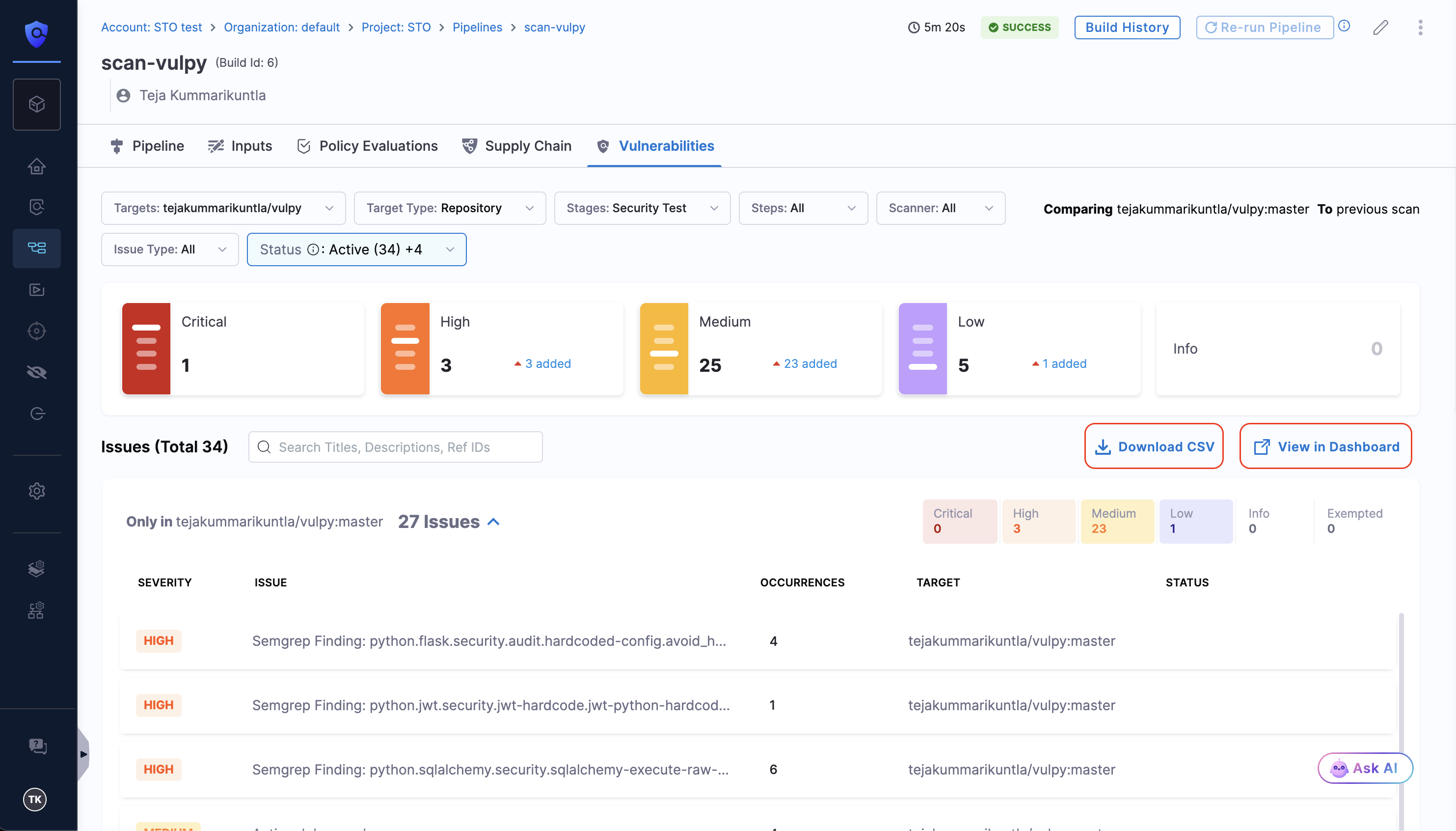 • The View in Dashboard option now redirects you to the Pipeline Execution Summary Dashboard, automatically applying your pipeline execution ID as a filter to view detailed scan results.