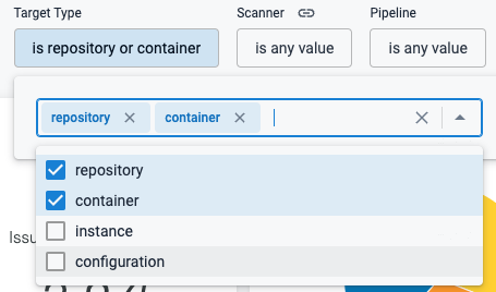 • The Security Testing Dashboard includes a new set of filters for drilling down into specific issues by project, creation date, scanner, target, pipeline, severity, and so on. You can drill down to a set of relevant issues and then click on a pie slice, chart element, or other UI element to view details on the relevant issues. (STO-5329)